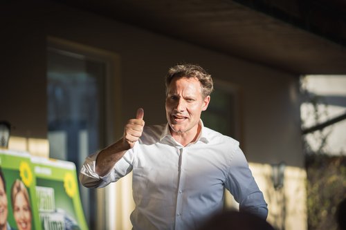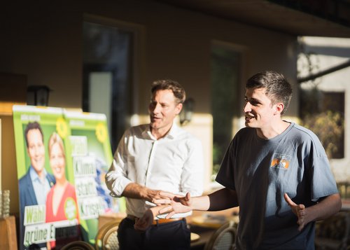 Im Anschluss an die Exkursion fand ab 17:30 Uhr unsere öffentliche Wahlkampf-Veranstaltung „Frag Ludwig Hartmann“ auf der Dachterrasse des Café Krönners statt. Nach der Begrüßung stellte Jakob Koch, unser Direktkandidat für den Landtag (Stimmkreis 111), sich und seine Themen vor. Jakob ist angehender Sonderpädagoge und setzt einen seiner Schwerpunkte auf die Bildungspolitik. „Bei der Bildung gibt es viel zu tun, um gleiche Bildungschancen für alle zu schaffen“, sagte Jakob. Beim Klimaschutz sei es essenziell, dass die Energie den Bürger*innen gehören muss. Konkret plädierte er dafür, dass das Walchenseekraftwerk wieder in Bürgerhand kommt. Mit Blick auf die aktuellen Umfragewerte der AfD und der Rhetorik von Freien Wählern und CSU müssten wir uns bewusst sein: „Demokratie, das sind wir alle. Bis zum 8. Oktober ist daher unser Ziel alle an die Urne zu bringen und gemeinsam für Bayerns Zukunft zu kämpfen.“