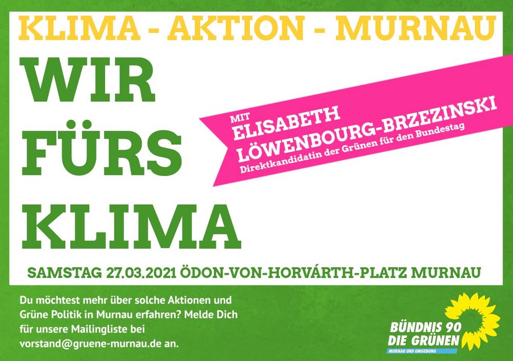 Wir, Bündnis 90/Die Grünen Ortsverband Murnau & Umgebung wollen, an die Pandemie-Anforderungen angepasst, protestieren und deutlich machen, dass wir mehr und stärkere Maßnahmen wollen, die unser Klima schützen. Die Notwendigkeit dieser Maßnahmen darf nicht mehr bezweifelt werden. Es geht um unsere Lebensgrundlagen, die zu schützen nur noch wenige Jahre Zeit bleibt.