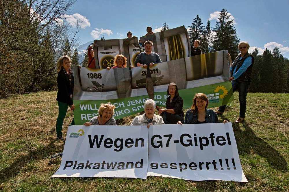 Am 26. April 1986 kam es im ukrainischen Tschernobyl zur bis heute größten Reaktorkatatstrophe. Block 4 des Atomkraftwerkes geriet bei der Simulation eines Stromausfalles ausser Kontrolle und explodierte schließlich. Nach Schätzungen der WHO wurden dabei 600.000 Menschen einer hohen Strahlendosis ausgesetzt. Von den unzähligen Helfern sind heute 125.000 infolge ihres Einsatzes in und um die Reaktorruine erkrankt, 10.000 sind bisher gestorben. Die Landtagsfraktion und der Kreisverband Garmisch-Partenkirchen wollten mit einer Plakataktion am 24.April an diese Katastrophe erinnern. Doch beinahe wäre die Aktion gescheitert, denn als Standort war eine Plakatwand nahe dem Eisstadion vorgesehen. Der Mitarbeiter der beauftragten Plakatfirma schaffte es auch noch, das Plakat in der mittlerweile wegen des G7-Gipfels zur Sicherheitszone erklärten Parkplatzareals anzukleben; dank seines Sonderausweises, der ihm Zutritt zum Gelände verschaffte. Doch sich mal eben für Fotos vor der Wand aufzustellen funktionierte nicht. Deshalb wichen Claudia Stamm und die Mitglieder des Kreisverbandes, mangels einer geeigneten Plakatwand in Garmisch-Partenkirchen, auf den Parkplatz vor dem Tierheim aus und hielten ein zweites Exemplar des Plakates, das kurzerhand beschafft wurde, selbst in die Luft.