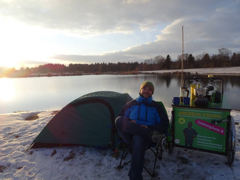 In Weilheim sprach er auf der Demo gegen die Schließung der Geburtsstation, diskutierte in Schongau mit Mittelschülern über Demokratie und Parteien und half auf einem Bio-Hof in Wildsteig morgens im Stall, als es im Zelt zu kalt wurde. In Peiting musste er die Bremsen seinen Rades reparieren lassen, weil sie festgefroren waren. In Polling übernachtete er in der Erstaufnahmeeinrichtung für Asylbewerber. In Murnau sprach er bei einem Infostand über das neue