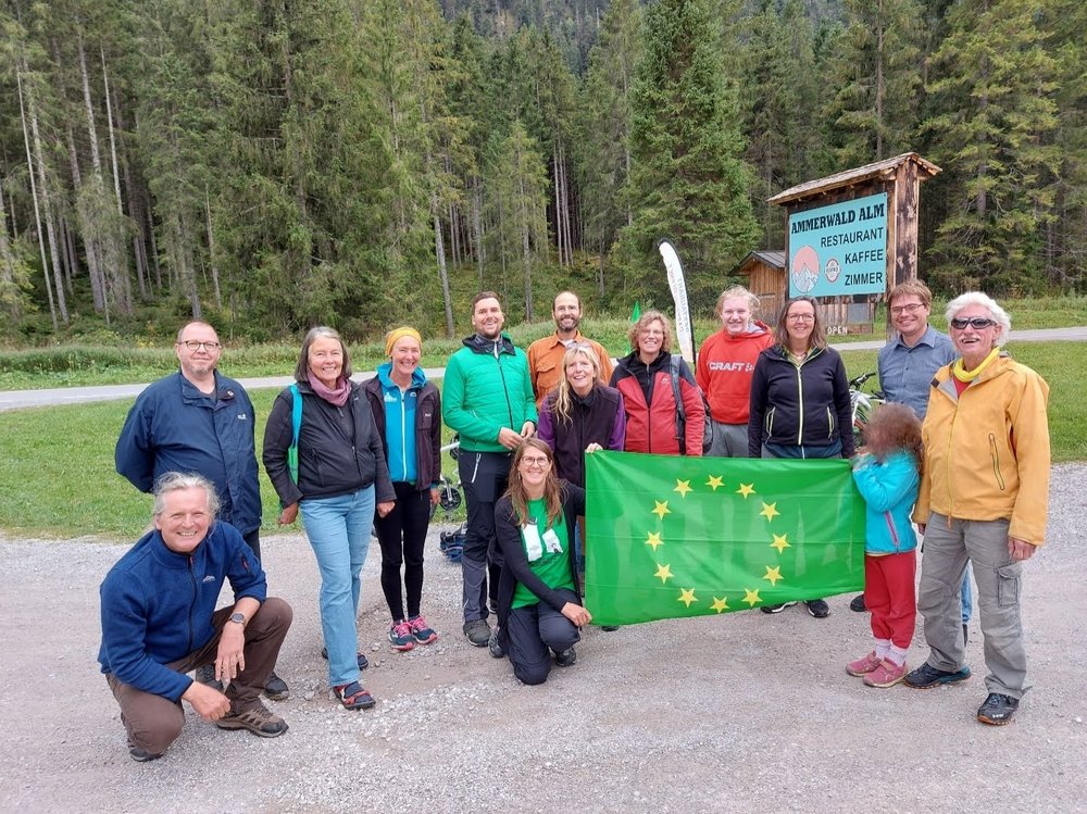 Gruppenfoto: Verterinnen der Tiroler Grünen u.a. Regina Karlen (Sprecherin des Bezirksvervandes Reutte ) und Michael Mingler (Abergeordneter des Tiroler Landtages) zusammen mit Vertreter*innen unseres Kreisverbandes u.a. Christl Freier (Sprecherin der Kreistagsfraktion), Georg Buchwieser (Bezirksrat), Thomas Stärz (Kreissprecher), Birgit Hammer & Petra Daisenberger (Sprecher*innen Ortsverband Murnau)