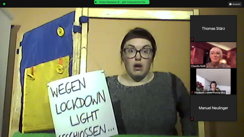 Mit Chiara Nassauer-Boitsos feierten wir auch zugleich eine weitere Premiere. In einem nur zehnminutigen live Theaterstück vermittelte sie am Beispiel ihres eigenen Theaters eindrücklich, wie die verschiedenen Pandemiephasen und die damit verbundenen Lockdowns und anderen Einschränkungen sich auf die Theater und die dort Mitwirkenden, aber auch letztlich auf alle Künstler*innen und Kulturschaffenden auswirkten und noch immer auswirken. Sie waren mit die ersten, die vom Lockdown 2020 betroffen waren, und leben seitdem in einem de-fakto Berufsverbot.