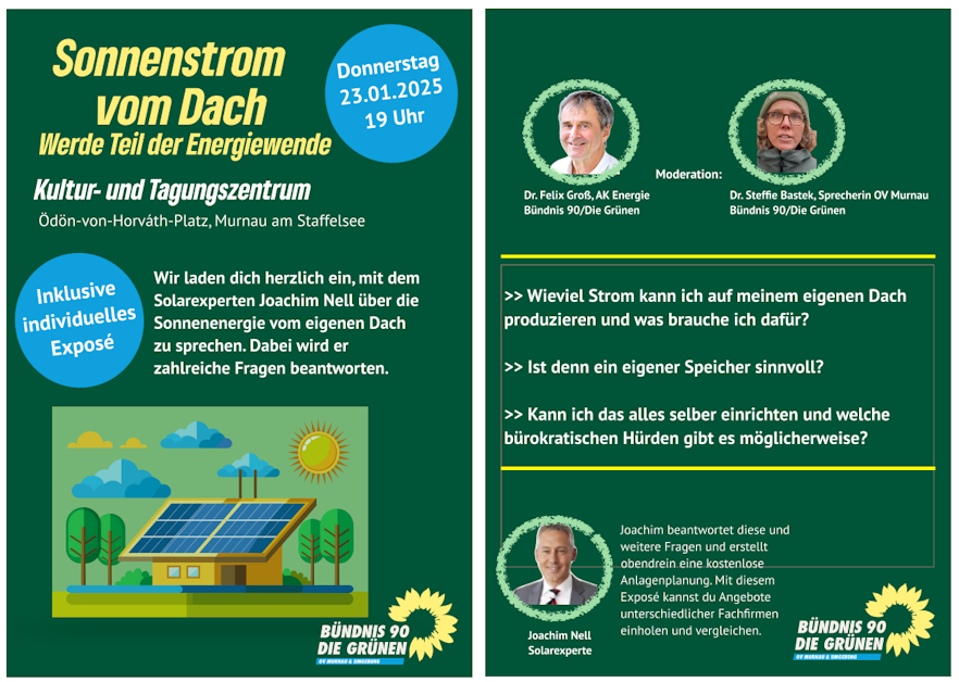 Da dieses Unterfangen uns Grüne auch sehr umtreibt, haben wir für den 23. Januar ab 19 Uhr im Murnauer Kultur- und Tagungszentrum einen Raum gebucht. Dort wird der Solarexperte Joachim Nell allen Anwesenden aufzeigen, was bei der Planung, Anschaffung und Installation einer Solaranlage zu beachten ist.