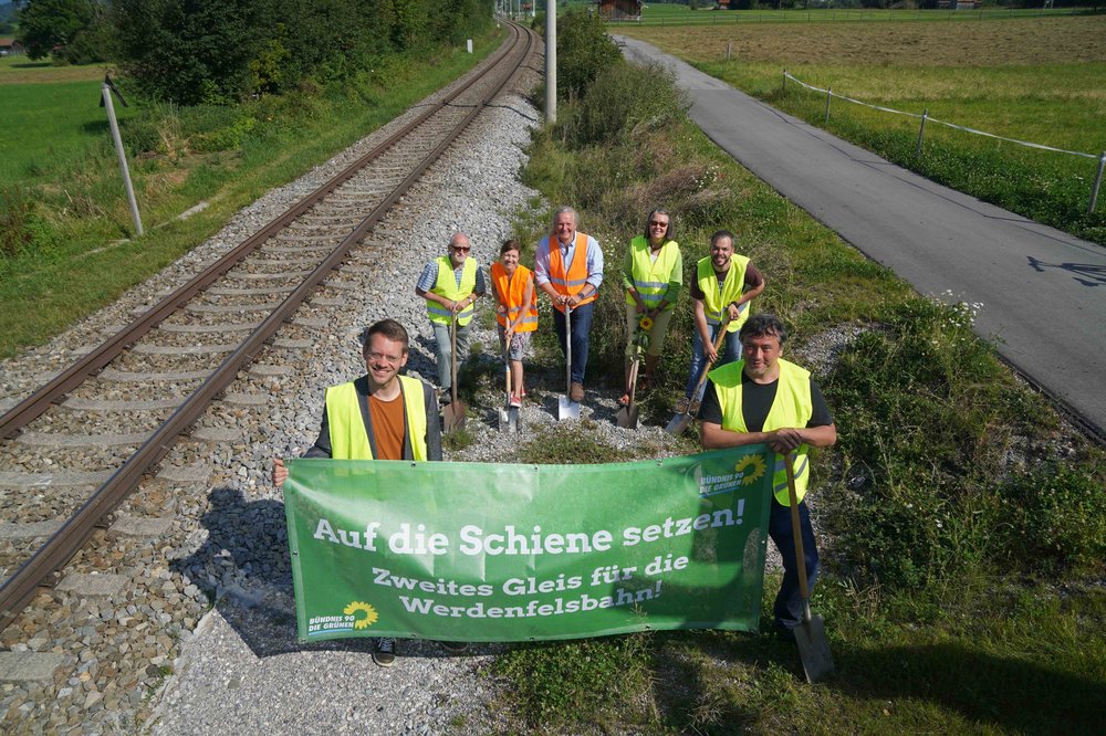 Die Mandatsträger*innen aller politischen Ebenen der Grünen im Landkreis Garmisch-Partenkirchen setzten zusammen mit der hiesigen Grünen Direktkandidatin für den Bundestag Elisabeth Löwenbourg-Brzezinski und dem Landesvorsitzenden der Grünen Thomas von Sarnowski ein Zeichen für den Ausbau der Werdenfelsbahn.