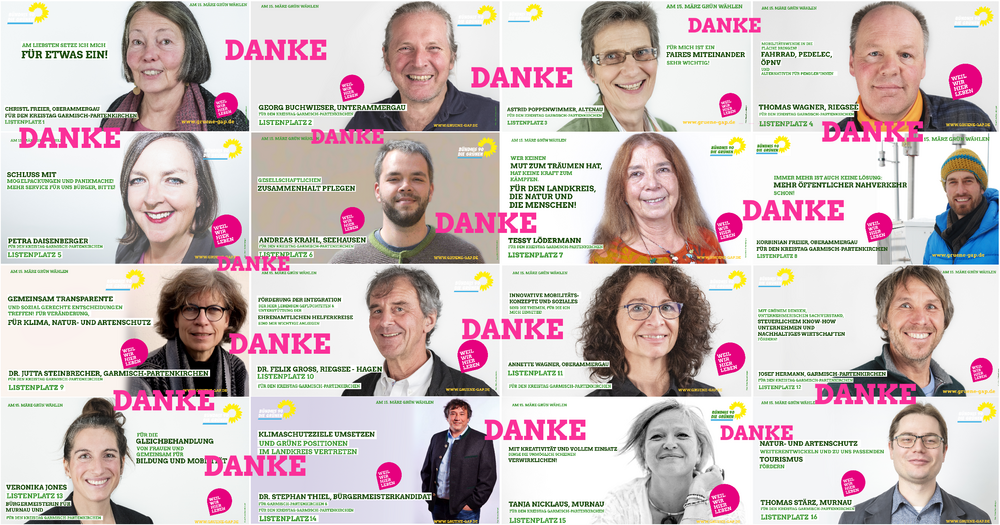 wir haben einen eindeutigen Auftrag der Wähler*innen im Landkreis Garmisch-Partenkirchen bekommen, uns als frischen Wind, der nun in die kommunalen Parlamente gestärkt eingezogen ist, zu positionieren! Dafür an allererster Stelle einen Dank an alle unsere Wähler*innen, die wie wir der Meinung sind, dass sich endlich was in Sachen Klimaschutz in Bayern bewegen muss. Wir können das Motto der Murnauer Grünen also auf den Landkreis ausweiten: "Schluss mit weiter so!"